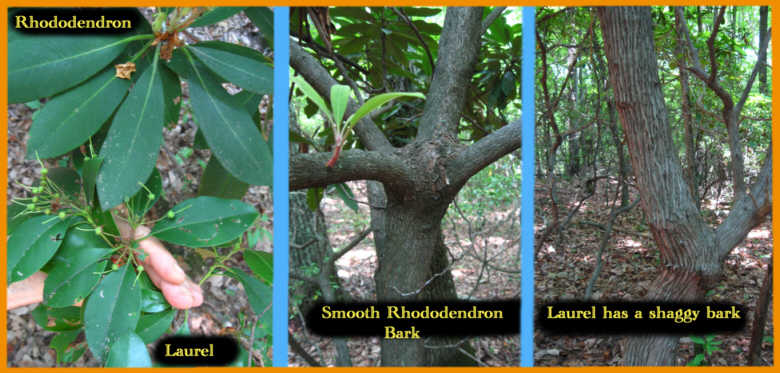- Bark. Mt. Laurels have ribbed bark that peels. Rhododendron bark is fairly smooth.