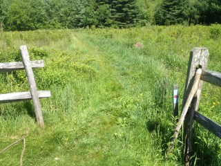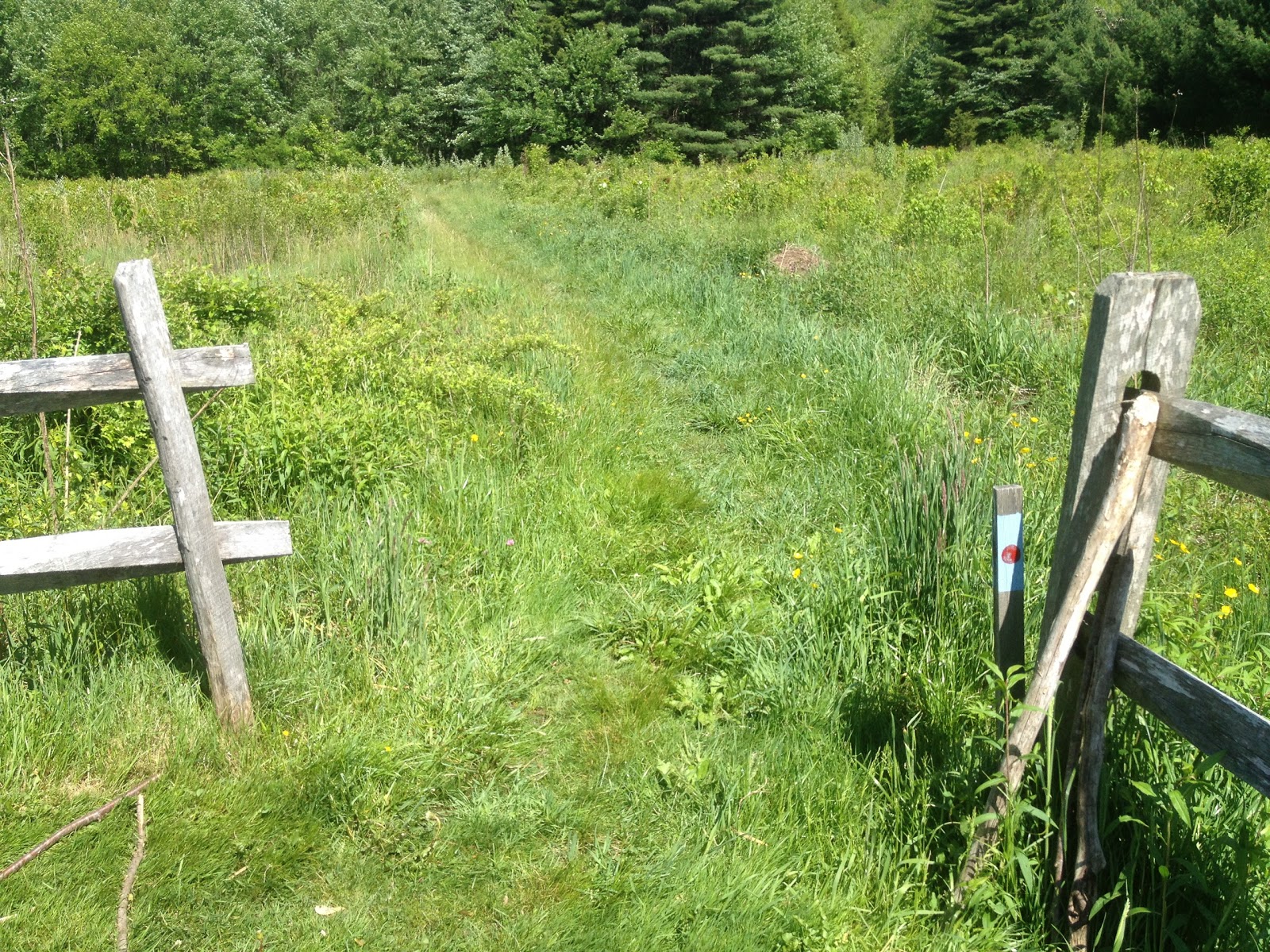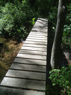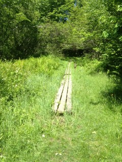 The grass was pretty high and looked like tick country. We pulled two ticks off of us and the dog after walking through. The trail curves to the left and then provides some boards to walk on to help you stay out of the grass.