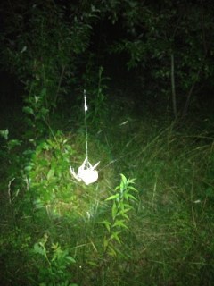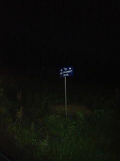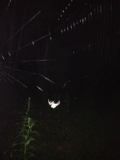 Not long after this, it became too dark to take many pictures. Thanks to previous experiences, we had a few flashlights in our packs. It was a testament to the fact that this section of the trail was well marked in the woods portions (connections between woods and roads not as much). We were able to follow the trail using flashlights which meant that most blazes were within line-of-sight of the next one. We did encounter a number of huge (apricot sized) spiders spinning person-sized webs across the trail.