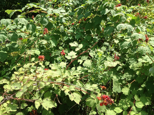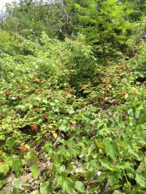 From here, it was a fairly short hike back to the dead-end of Summit Wood Drive. Right near our parking spot, there was a large patch of American Red Raspberry (Rubus idaeus) so we went raspberry picking!