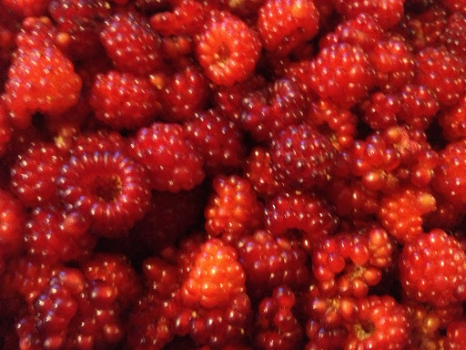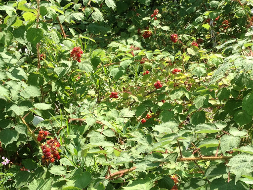 In the corner of the meadow, near where the trail reenters the woods, there was a large bush of American Red Raspberry (Rubus idaeus) with ripe berries.