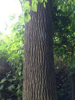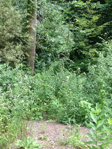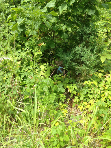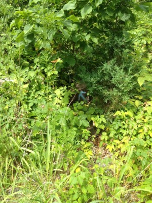 The trail was fairly well marked until the end of the section when the blazes just died out and the trail was overrun with grass and other plants. This is where the trail enters the woods from the Victoria Drive side. Note the blue blaze on the tree to the left.
