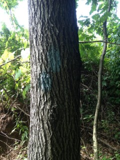 On the upper right hand side of this intersection, we saw blue blazes on a few trees.