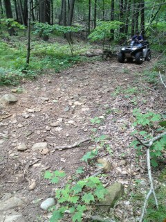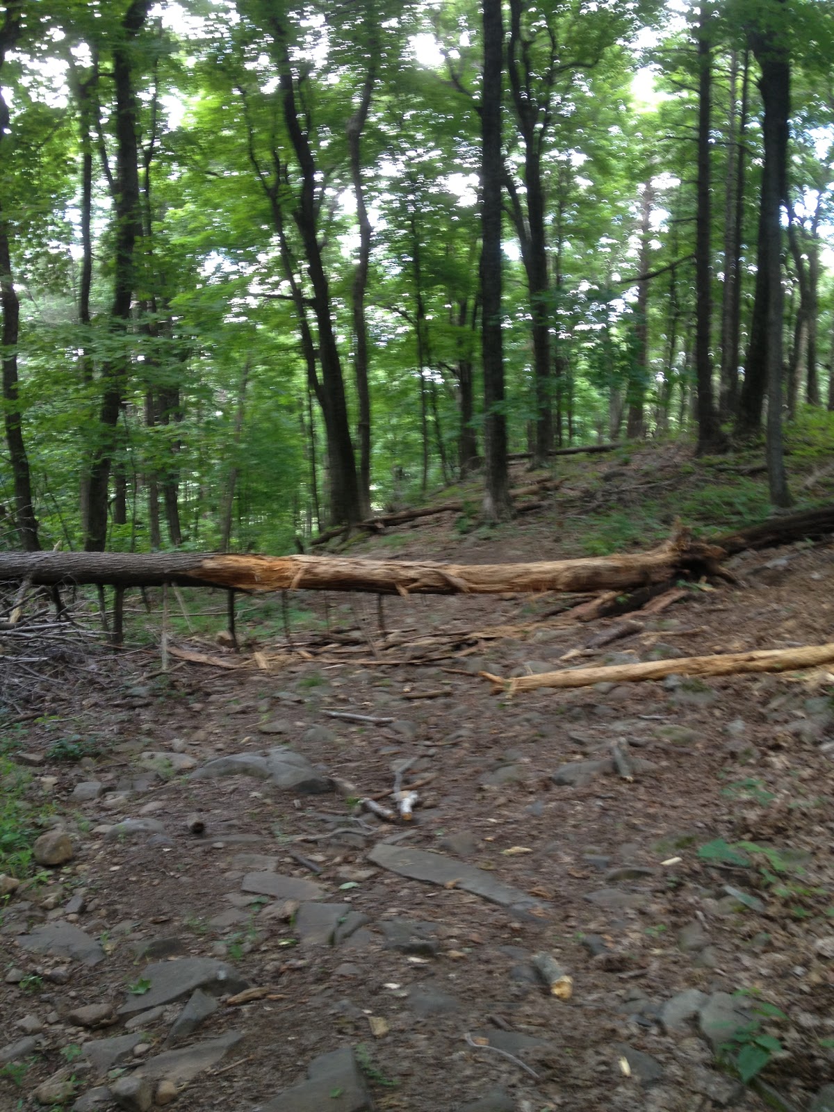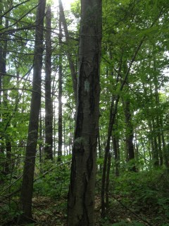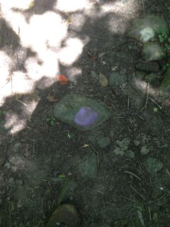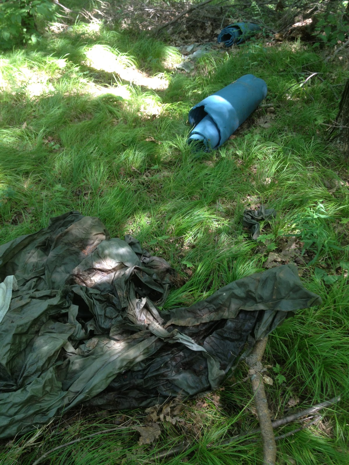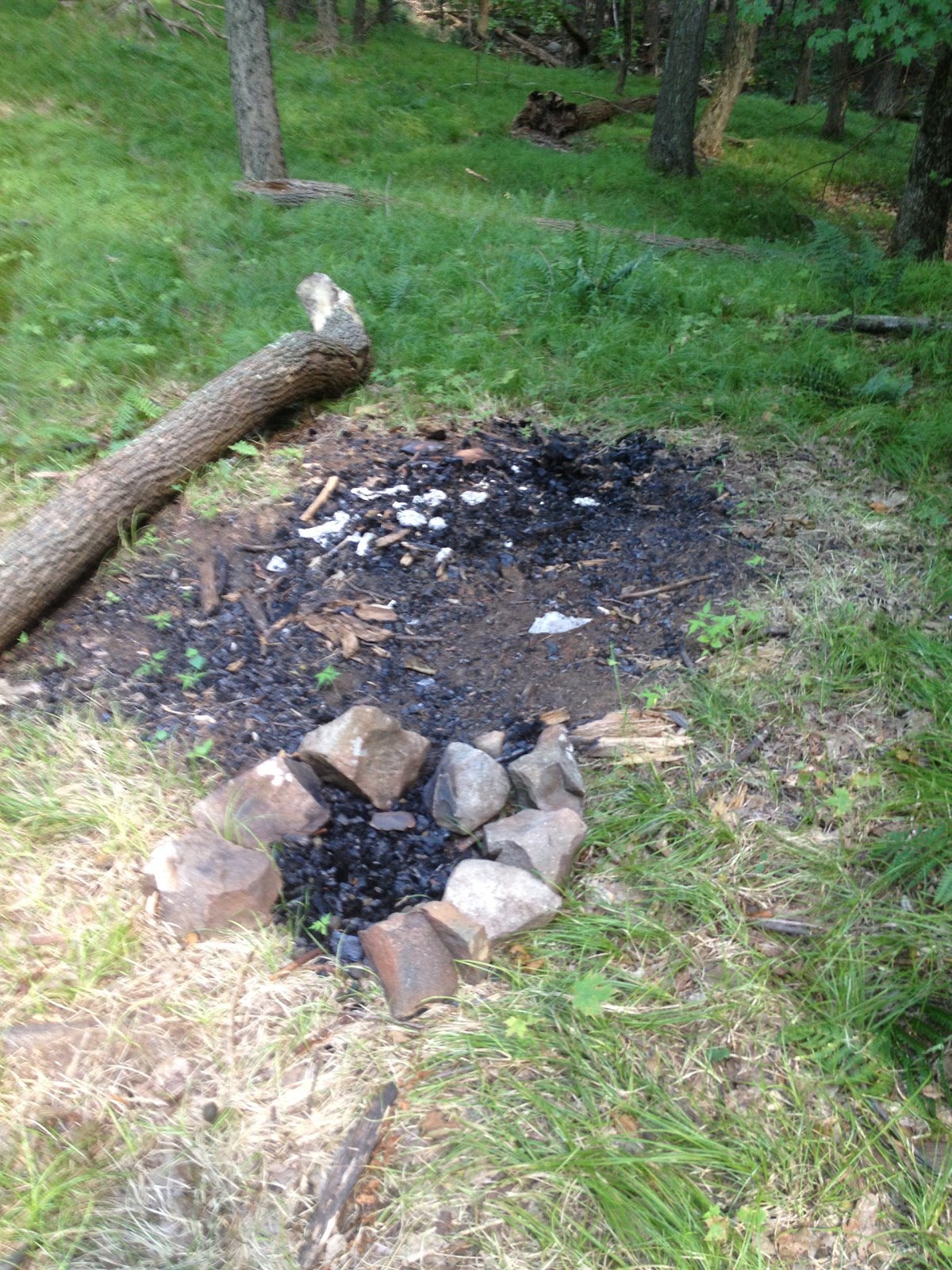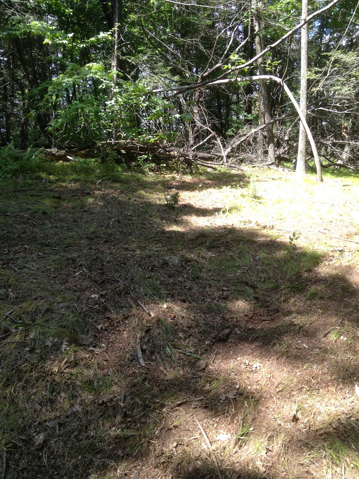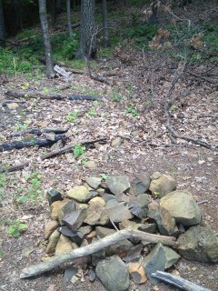 After this, it got really frustrating. The trail went up and to the right (we needed to go straight but there was no way to do that). We tried going to the left for a bit (unmarked trail), hoping it would straighten out; it didn’t and we hiked back to our starting point. We then went to the right, following the black trail. Turns out, it lead us back to that horribly confusing intersection. At this point, we said forget this and, using GPS, tromped into the woods to find our own way. We went through the woods and came upon an old campsite.