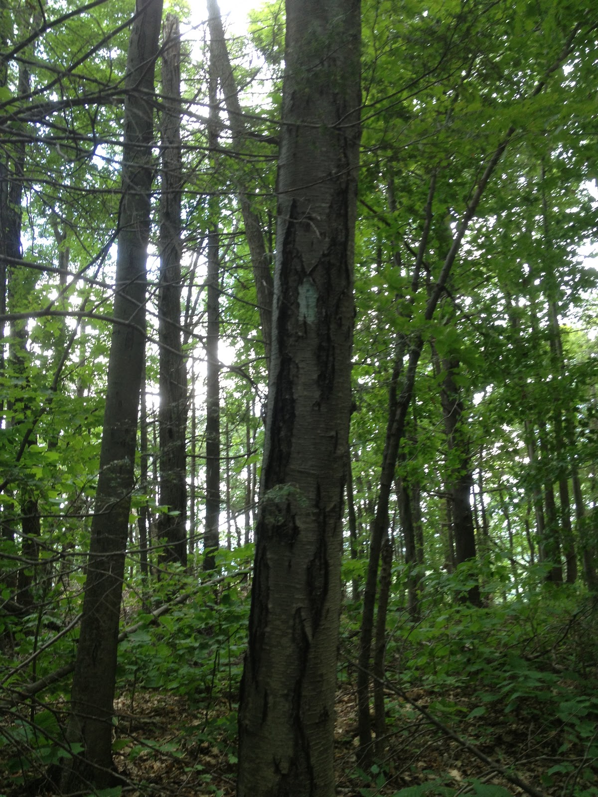 From here, the trail entered the woods. We followed the blue trail for a while before we reached a fallen tree and realized that the blue markings had just petered out.