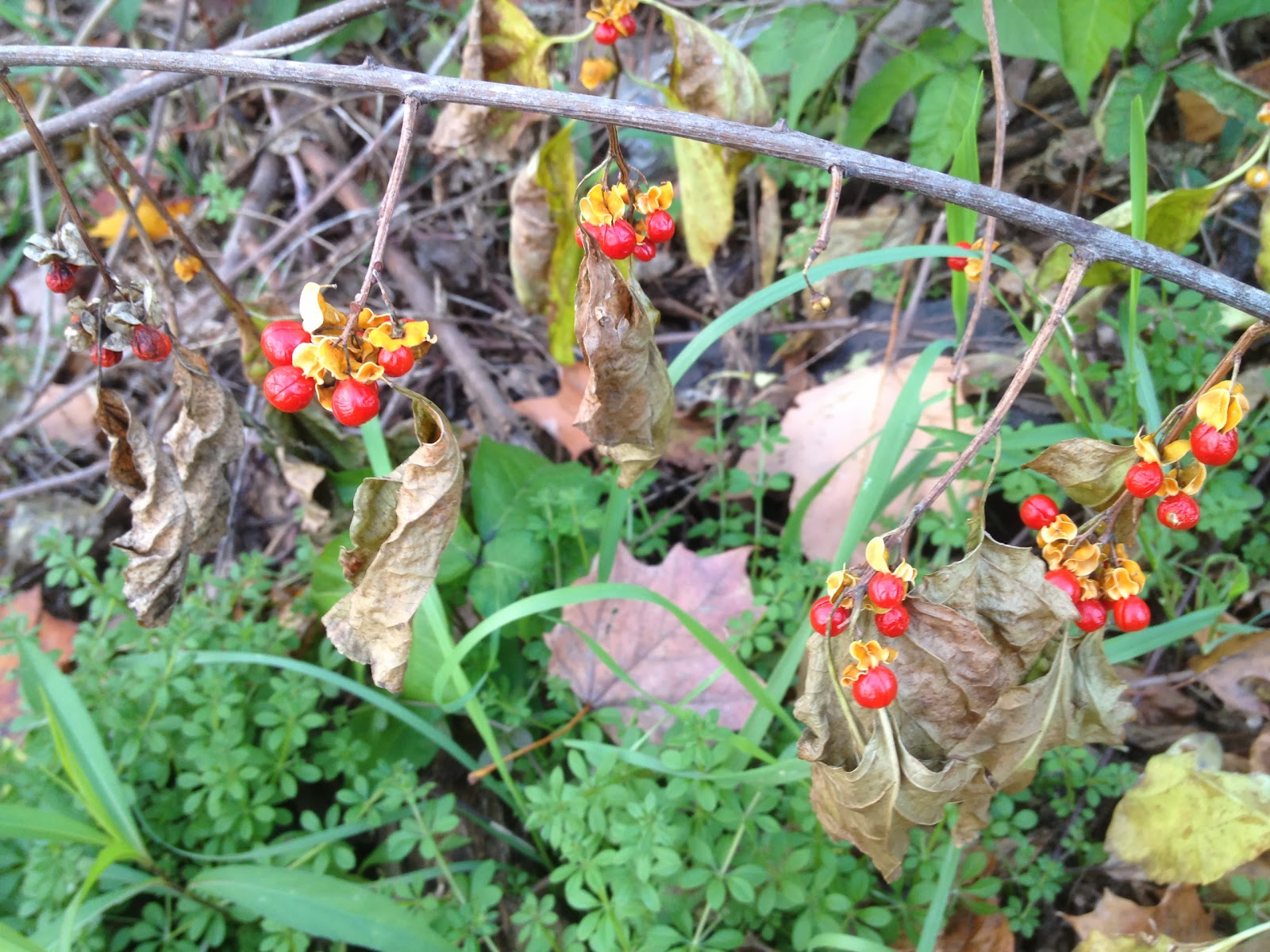 Summary: We started our hike from Roger’s Orchard. We walked to the Shuttle Meadow Road trail head and began our hike. The woods in this area had quite a lot of ripe rose hips (edible – first picture) and Common Bittersweet (poisonous – second picture).