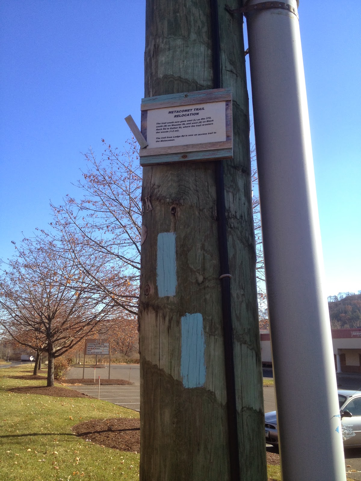 440 New Britain Ave., Plainville, CT – We parked in a doctors’ offices parking lot across the street from where the Metacomet enters the woods again after a road walk. The parking lot is very large and is not used by patients on evenings and weekends.