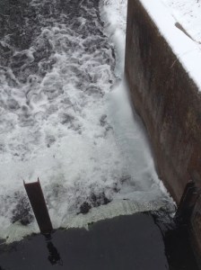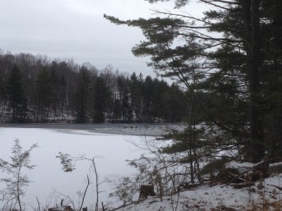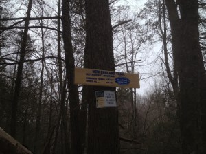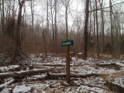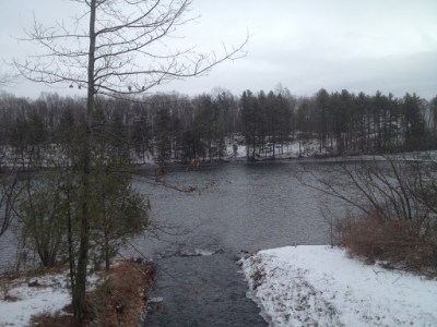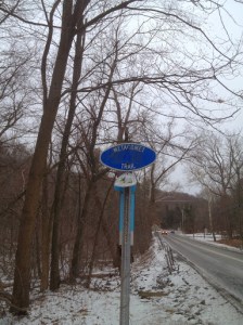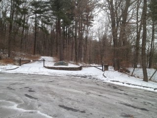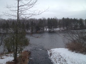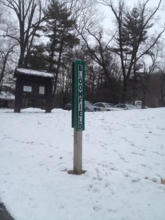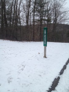 We saw signs indicating that starting in March 2014, this section of Metacomet trail would be redirected due to the MDC’s tree trimming project near the reservoir. Around this point of the hike, we began encountering snow flurries which continued for the remainder of the hike. The blue trail emerged near the top of the reservoir and followed the main track down to Reservoir #6’s parking lot. The view of the reservoir was beautiful.
