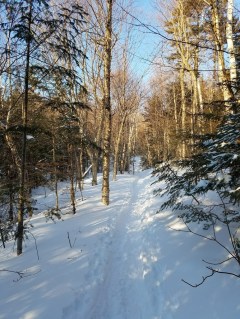 The Highland Center had 24′ of snow at their stake, with 7′ dropped in the past 48 hours. After asking around, I decided to forgo snowshoes. The ones I had were more sturdy than lightweight, and I didn’t really have anywhere good to put them when I wasn’t wearing them. I put on my Hillsound Trail Crampons in the parking lot and didn’t take them off until I returned from the hike. Since this hike is relatively popular, many people in snowshoes had gone through and packed down the trail, making it possible to leave behind the snowshoes. The weather was perfect for hiking – calm and sunny; it was 12 degrees when I started and 38 degrees by the time I finished my hike.