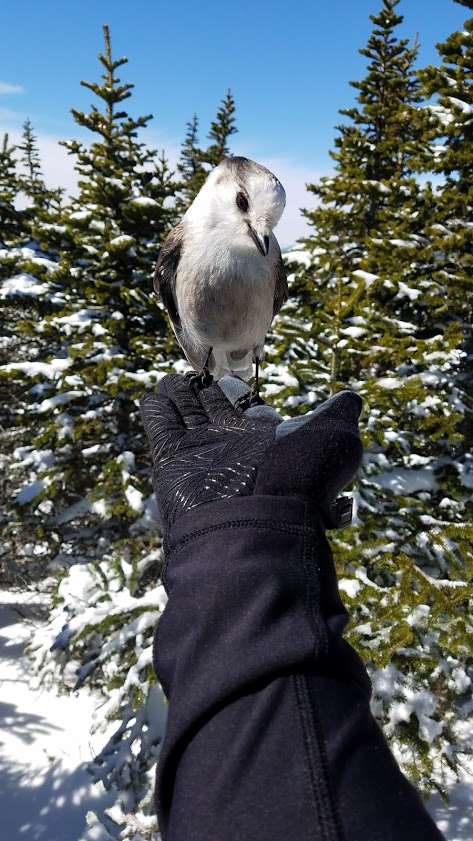 After 1.4 miles of struggle, I made it to the top of Mt Willey (4,285′). I chatted with the Plymouth day hikers for a bit and then they headed back the way we’d come. I took a few pictures and then decided to have a snack before heading back. As soon as I brought out a bag of trail mix, two birds appeared out of nowhere, looking for me to share. I held out trail mix in my hand and they readily flew to my palm to eat my offering.
