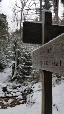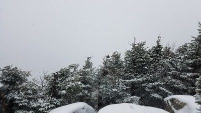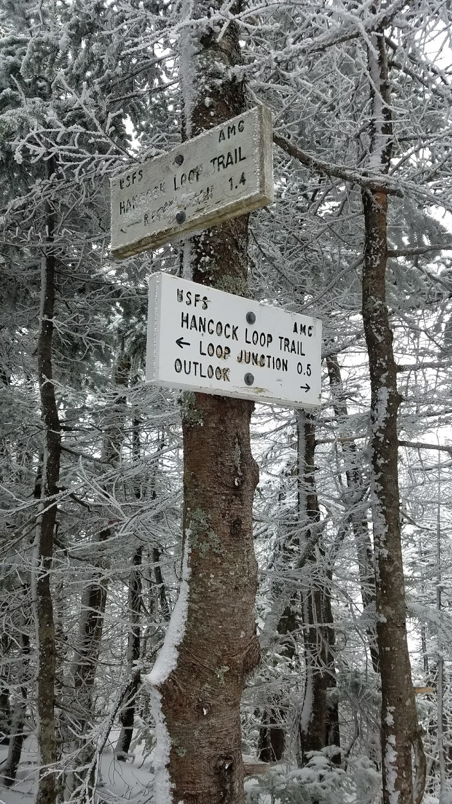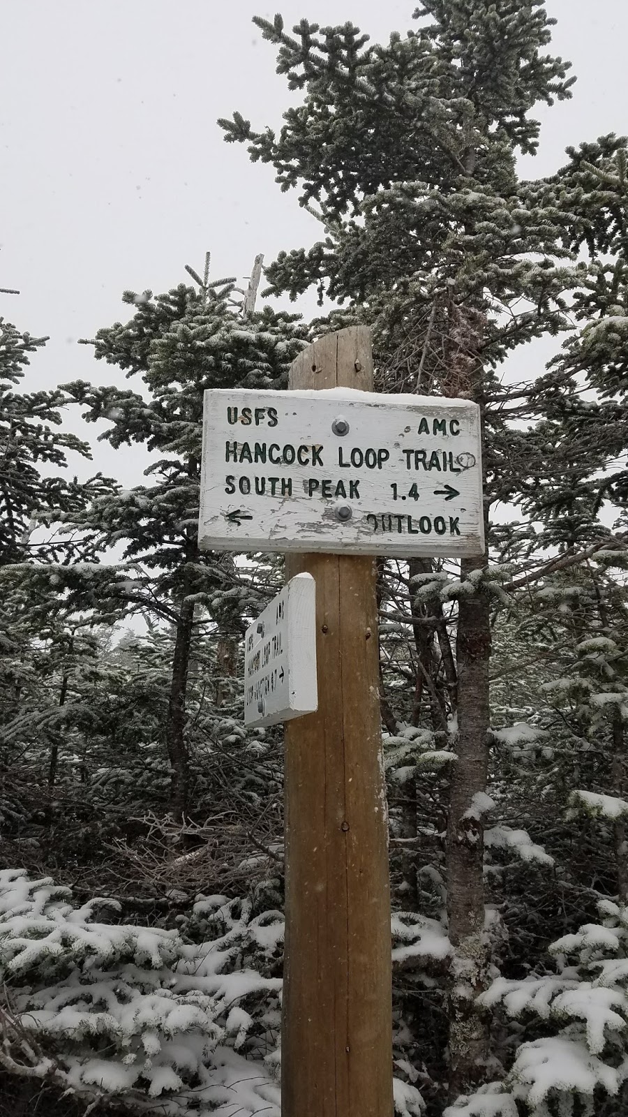 After another mile or so, I came to the loop trail split. I went to the left and did the loop in a clockwise direction. I don’t know that going in the anti clockwise direction up to the peaks would have been better; they were both very steep. I made it to the peak of Hancock first, and the lookout had no visibility due to the snow storm.