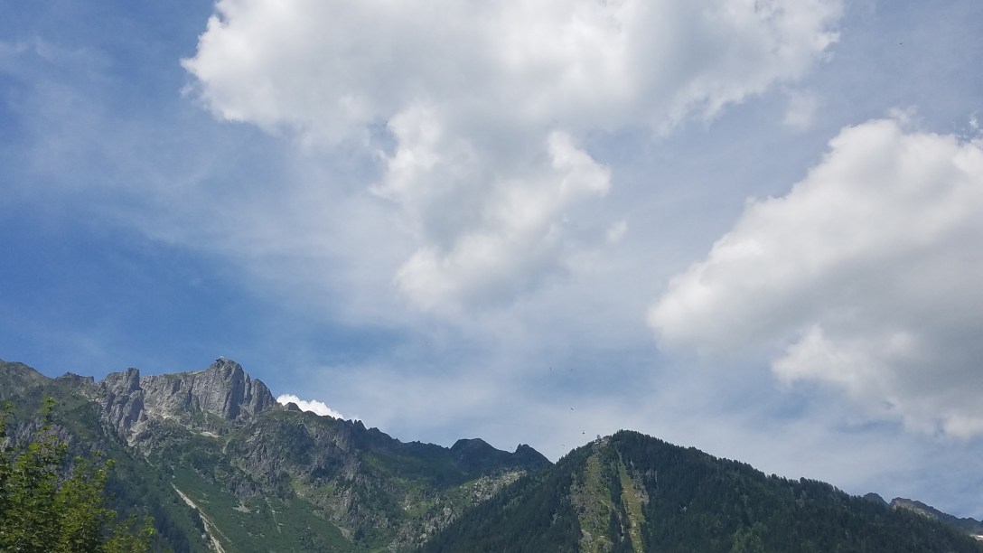 We met our guides, Caroline and Lionel, and took the cablecar up to the top of Plan Praz. They set up the gliders as we watched a few people take off; Caroline then strapped me in, gave me directions, and then she pulled the glider up into the wind and we took 2-3 steps forward down the grassy slope before we were airborne. Toby and Lionel took off a few minutes later, and we were in the air gliding along for the next 20-25 minutes. Toby had a smooth ride down, while I opted to experience some trick flying (like spiraling 360s where we were parallel with the glider. Caroline and I landed on our feet, while Toby and Lionel landed seated.