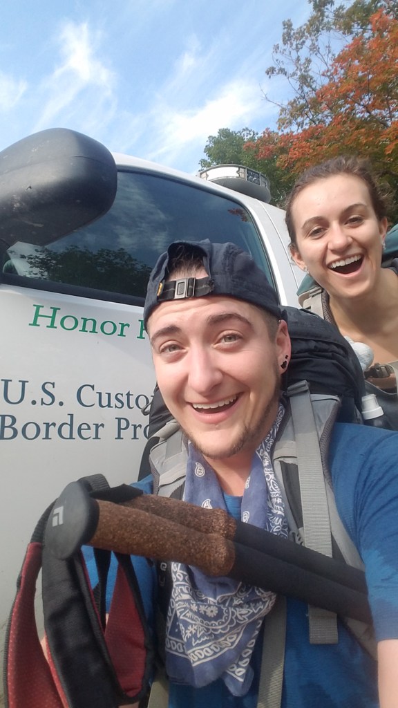 Towanda (AT NOBO ’15) and I started out from Journey’s End Camp around 7am. We traveled up the side trail to the Canadian border, took pictures, and started hiking south by 7:30am.