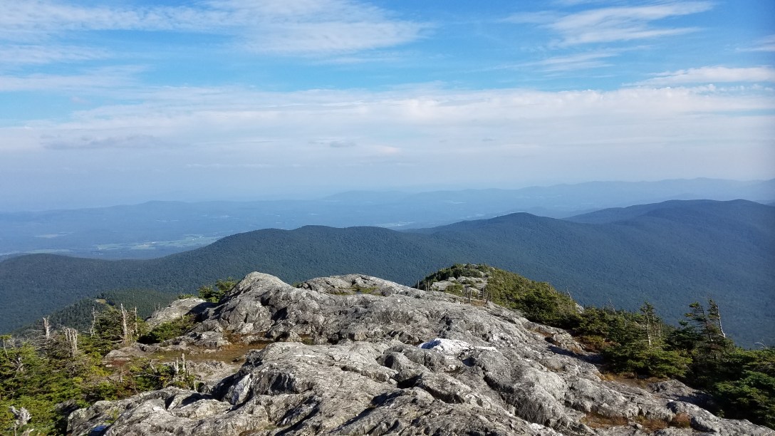 We then crossed the road and headed up Burnt Mountain. We descended to Shooting Star shelter, where we took our first break of the day, though they didn’t have any water available. From there, we climbed up to Doll Peak, with the elevation gain nearly doing us in. We then descended to Laura Woodward shelter, where we refilled on water and had a nice long lunch break. We then did the long ascent up to Jay Mountain, stopping to bushwhack over to Big Jay for one of my New England 100 Highest.