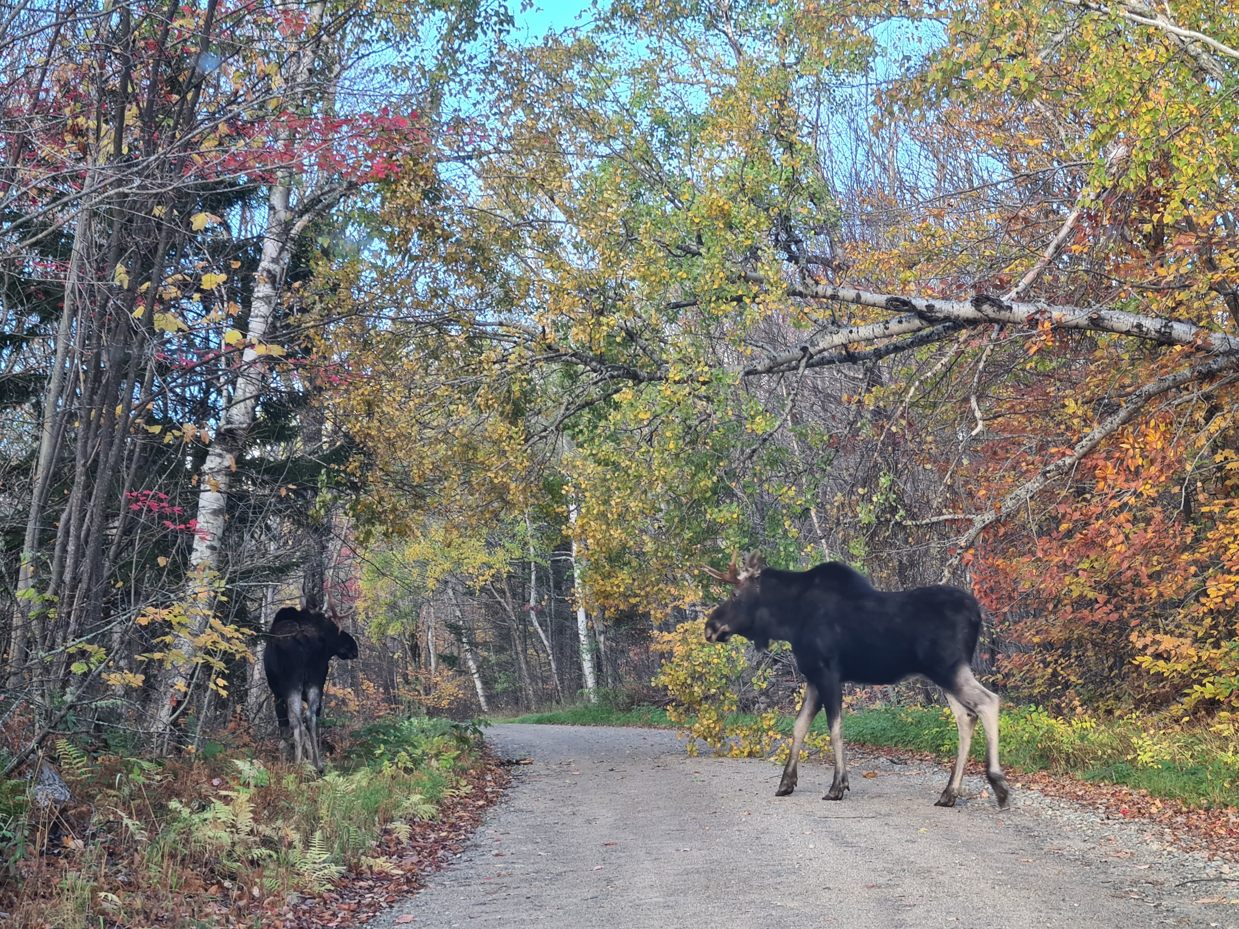 We got up early and went through Gorham, grabbing coffee drinks and breakfast sandwiches on the way to the Cabot trailhead. As we got close to to the York East trailhead, we encountered two bull moose next to the road, and they kindly wandered in front of our stopped car!