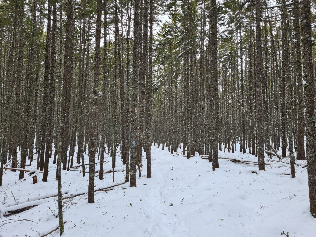 I packed up the rest of my backpack, strapped my snowshoes to the back, threw on my microspikes for good measure, and headed out by 11:45am. I hiked the 6.2 miles into Daicey Pond in just under 3 hours, which included a 10 minute chat with a Rhode Island guy, Mike, who was heading back to his car with his sled after turning around due to blow-downs and narrow trail.