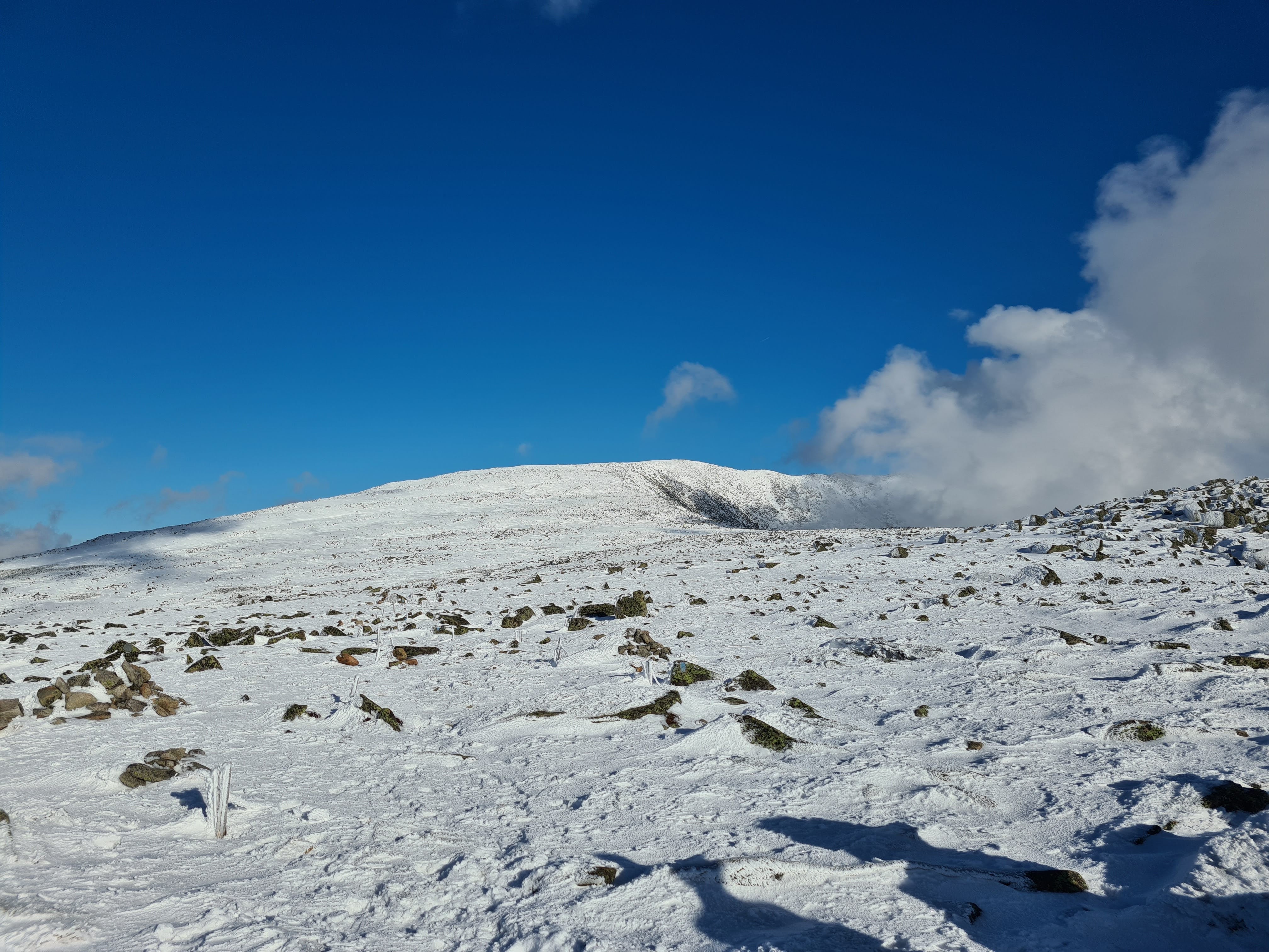 From Katahdin Baxter, we headed down to the saddle between Baxter and Hamlin and then hiked up to Katahdin Hamlin. From the saddle to Hamlin, we were slowed down by knee-deep snow with hip-deep drifts and no discernible trail. Closer to the top, we found cairns and that helped speed us along.
