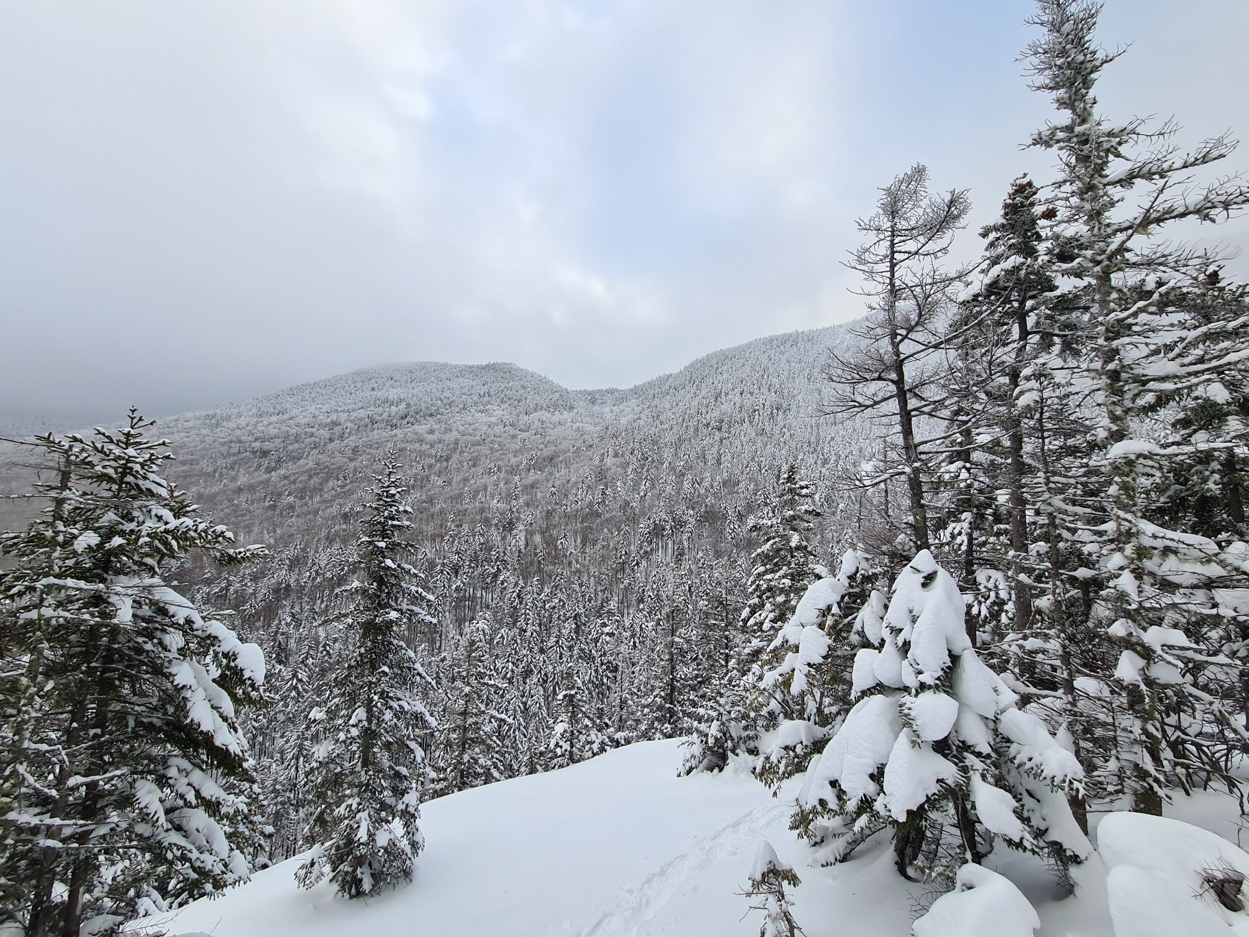 There was 2-3 inches of snow this afternoon, so the roads were a bit slick and sloppy so my drive to the trailhead took a bit more time than I’d anticipated. The parking lot in Grafton Notch was plowed, and I quickly parked and threw on my snowshoes. I was glad to see that Old Speck had been broken out by at least 3 other people before me. Snowshoes were needed, but it wasn’t a hard trip.