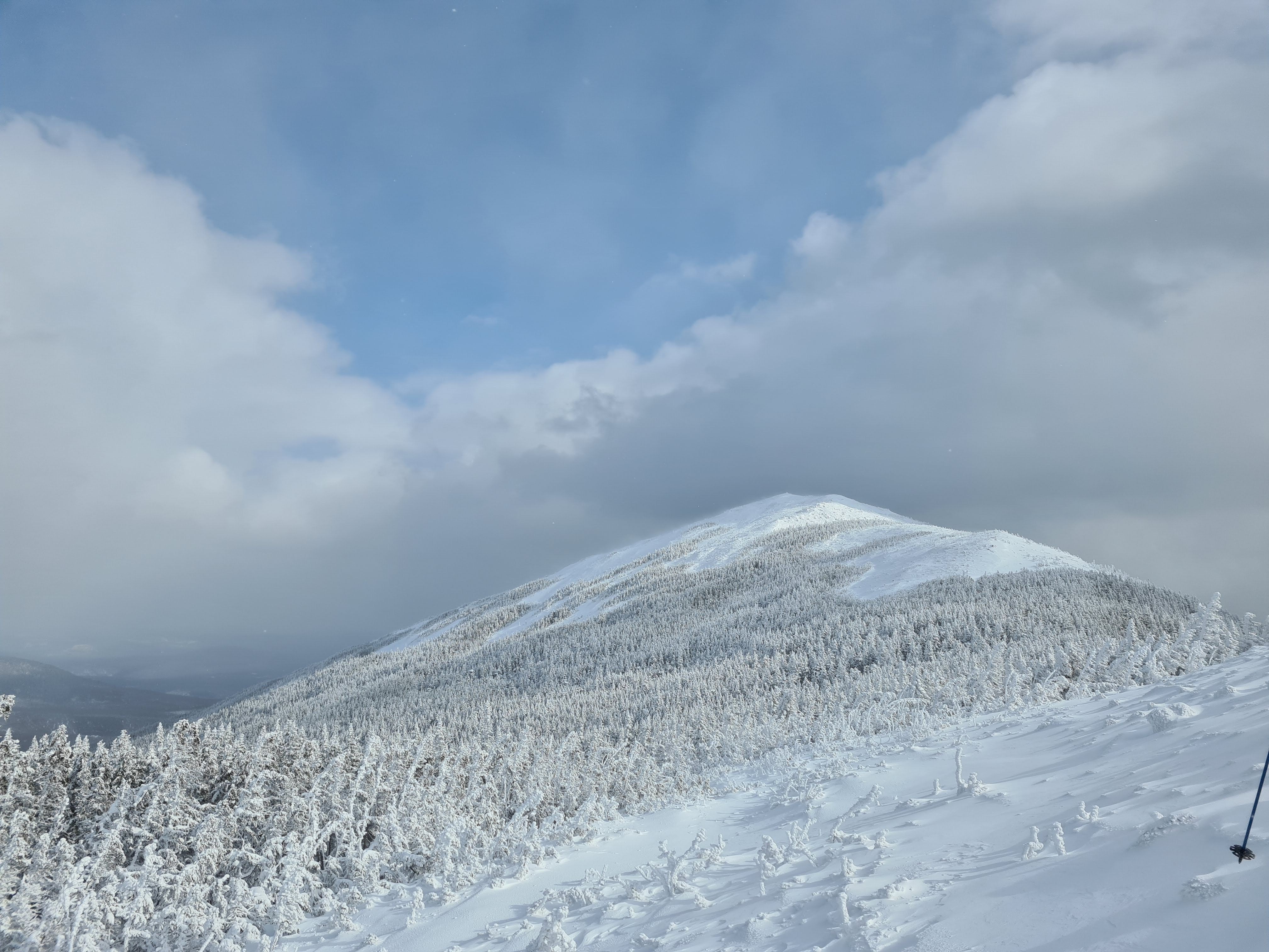 After some frustrating experiences with Sugarloaf’s uphill policy and needing to change parking lots, Kallie and I hiked up the ski trails, starting at the golf course/West parking lot, perhaps 15 minutes behind Rebecca. It was an annoying, arduous climb up to the peak of Sugarloaf, dodging skiers as they started to descend. There were no uphill signs or anything to aid us on our way or protect us from downhill traffic. Once we hit the summit, we quickly found the tracks left by Rebecca, Alex, and Matt and descended the side trail to meet up with the AT. From there, we pushed on to the spur trail for Spaulding. We ran into Rebecca’s group at the summit and chatted for a few minutes; Rebecca offered to give us a ride from the Mt Abraham trailhead, so we wouldn’t have to go back over Sugarloaf. We enthusiastically agreed.