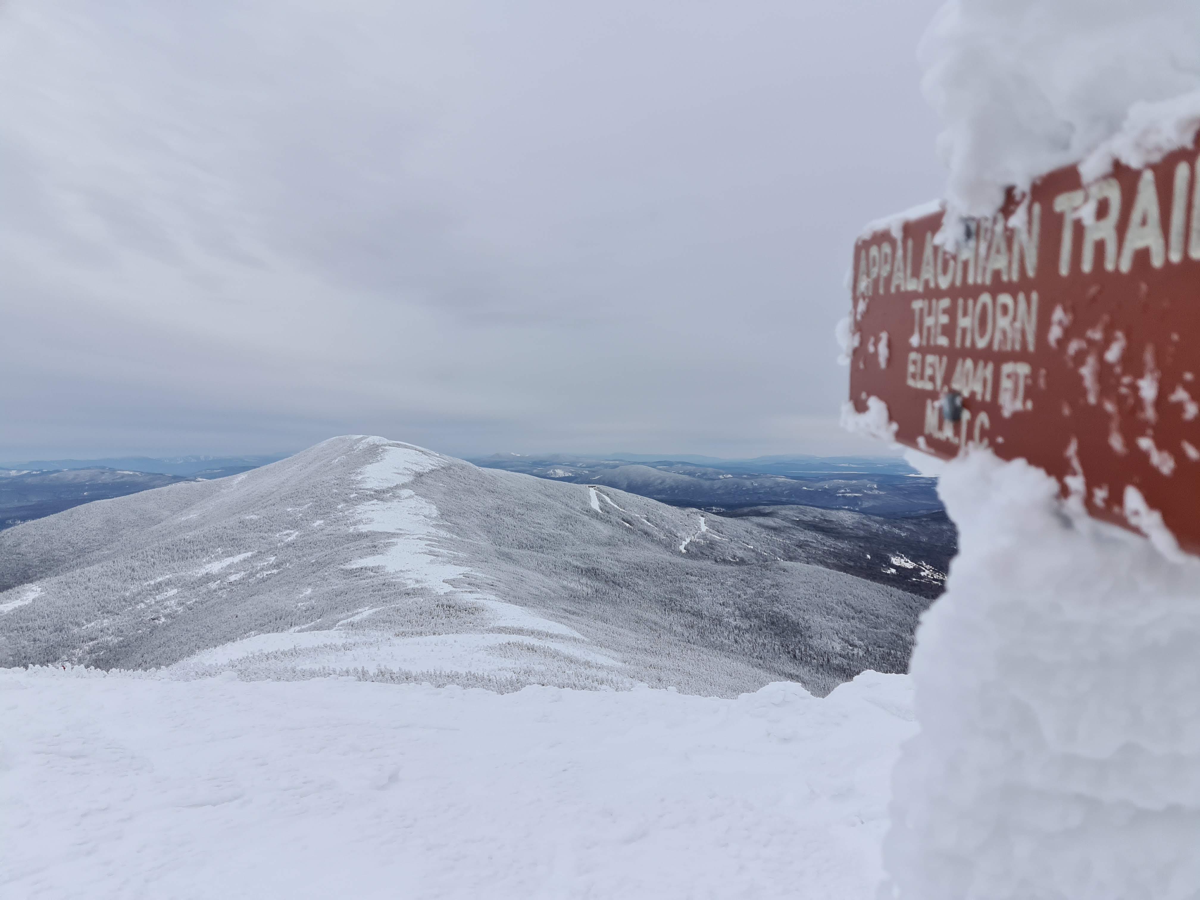 Saddleback’s uphill route was lovely. It’s fully packed down (skis or snowshoes required, with frequent signs reminding you of the fact) and a nice walk through the woods without having to worry about uphill traffic. From the top of the ski area, it’s very clear where the trail up to Saddleback starts, with a handy sign telling you that beyond this sign is out of bounds for the ski area. It was fully packed out to the summit of Saddleback, due to backcountry skiers. From Saddleback over to the Horn, it was hard, but possible, to follow the tracks from yesterday’s hikers. It was a mix of drifted power, ice, and partially packed powder. The winds on the Horn and Saddleback were ~35 MPH, but in the col between the wind was fairly calm. And heading back down the Uphill Access trail on the ski mountain was a relaxing way to end the day.