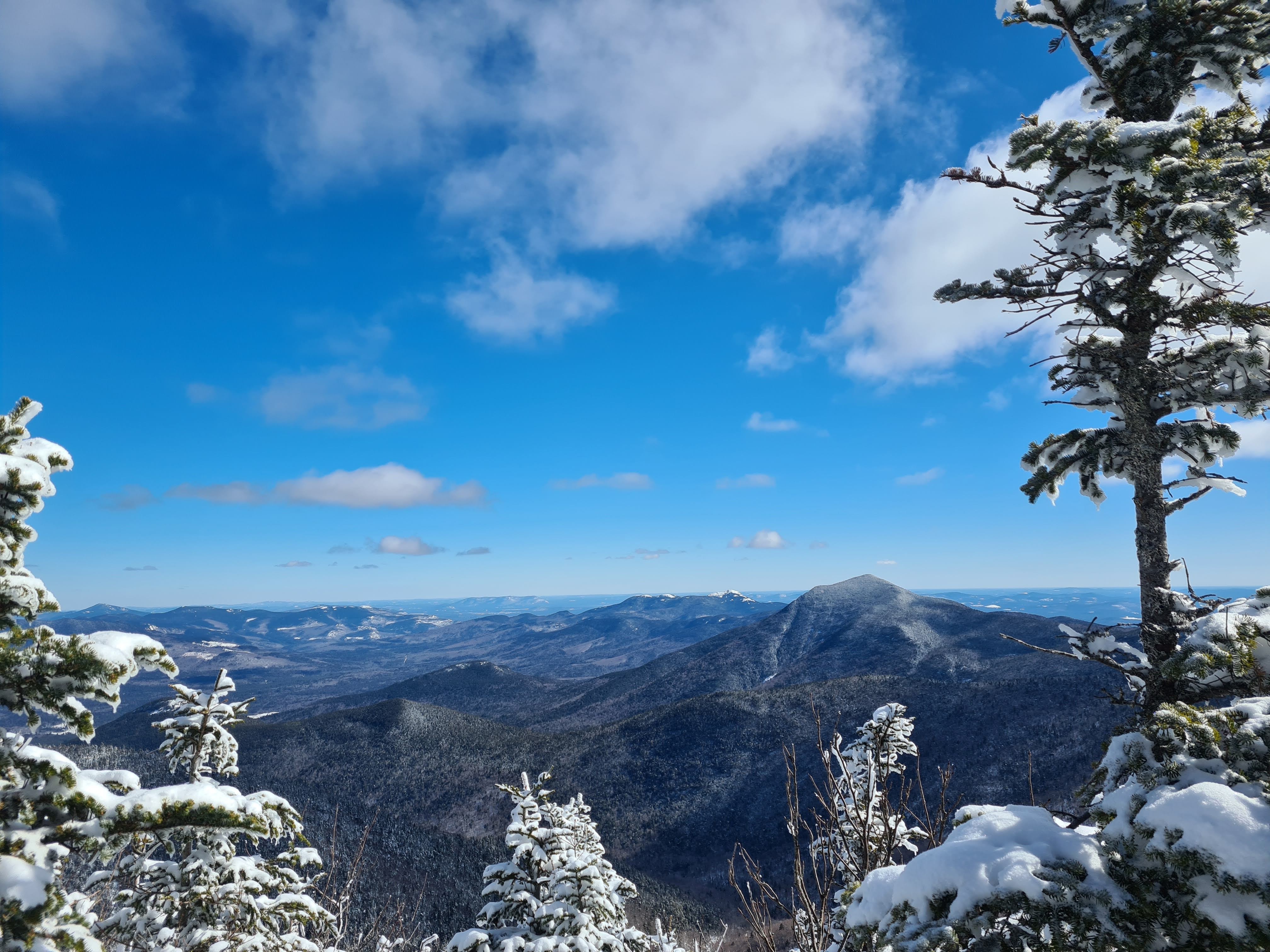 I parked my car in the Sabbaday Falls lot and the other 3 folks I was hiking with picked me up and we drove the mile down the road to the Pine Bend Brook trailhead. We weren’t certain if we could do the loop down Sabbaday, so we figured we’d have both options available to us with my car spotted (and the parking on the side of the road didn’t look promising for my front-wheel drive car). We hiked up Pine Bend Brook, up through the steep ravine and then up the long uphill section before the first Tripyramid summit. The trail was very well packed down, and we only needed spikes. On our way over towards the second summit, we passed by Sabbaday Falls trail, and while it looked like it had been hiked since the last snow storm, it would require snowshoes and I wasn’t confident about the 5 creek crossings we would have to get back to the car. So we decided that it would be best to just do an out-and-back. We dropped our backpacks by the trail intersection, summited the second peak, and then headed back down. We had some lovely fun butt sliding down the steep uphill section and into the ravine, and we made great time back to the cars.