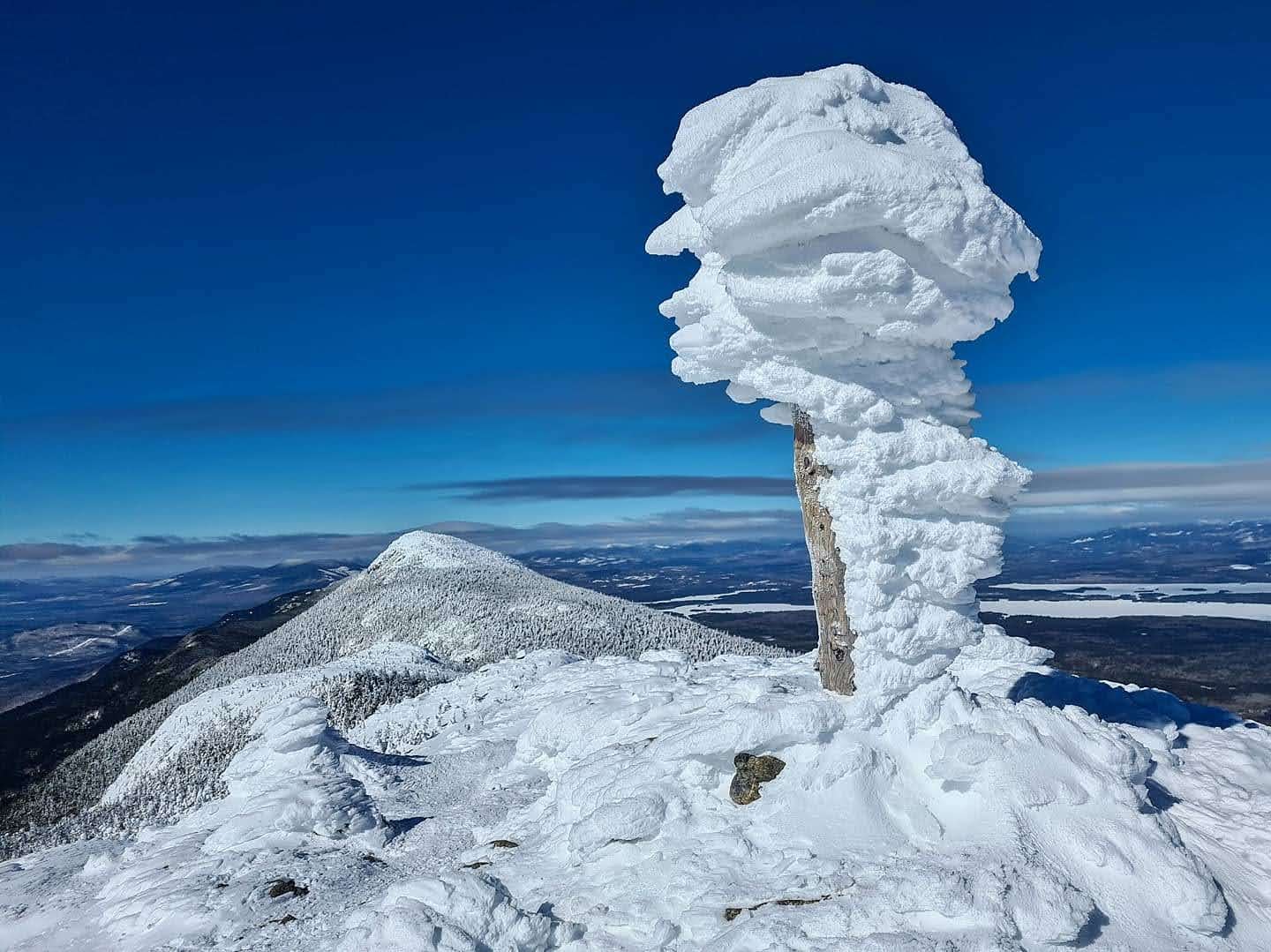 I walked along the snowmobile track until it splits and took the left-hand side to head towards the trailhead. I made really good time, since even after the trailhead, the trail was packed down and solid and I could wear spikes. I wore spikes until I started the final ascent up to the col between West and Avery, and swapped out for my snowshoes with heel lifts. Once at the col, I dropped my backpack and went up to Avery first. The wind at the summit took my breath away and I quickly scurried back below treeline. At the col, I had a snack, goofed off with the greyjays trying to get my snacks, and then picked up my backpack and headed over to West. I’d bundled up in anticipation of the wind above treeline on West and I was glad for that, because the 35 MPH wind was making it wicked cold. I took pictures to commemorate my Winter 67 finish and then quickly headed down, snowshoeing towards South Horn.
