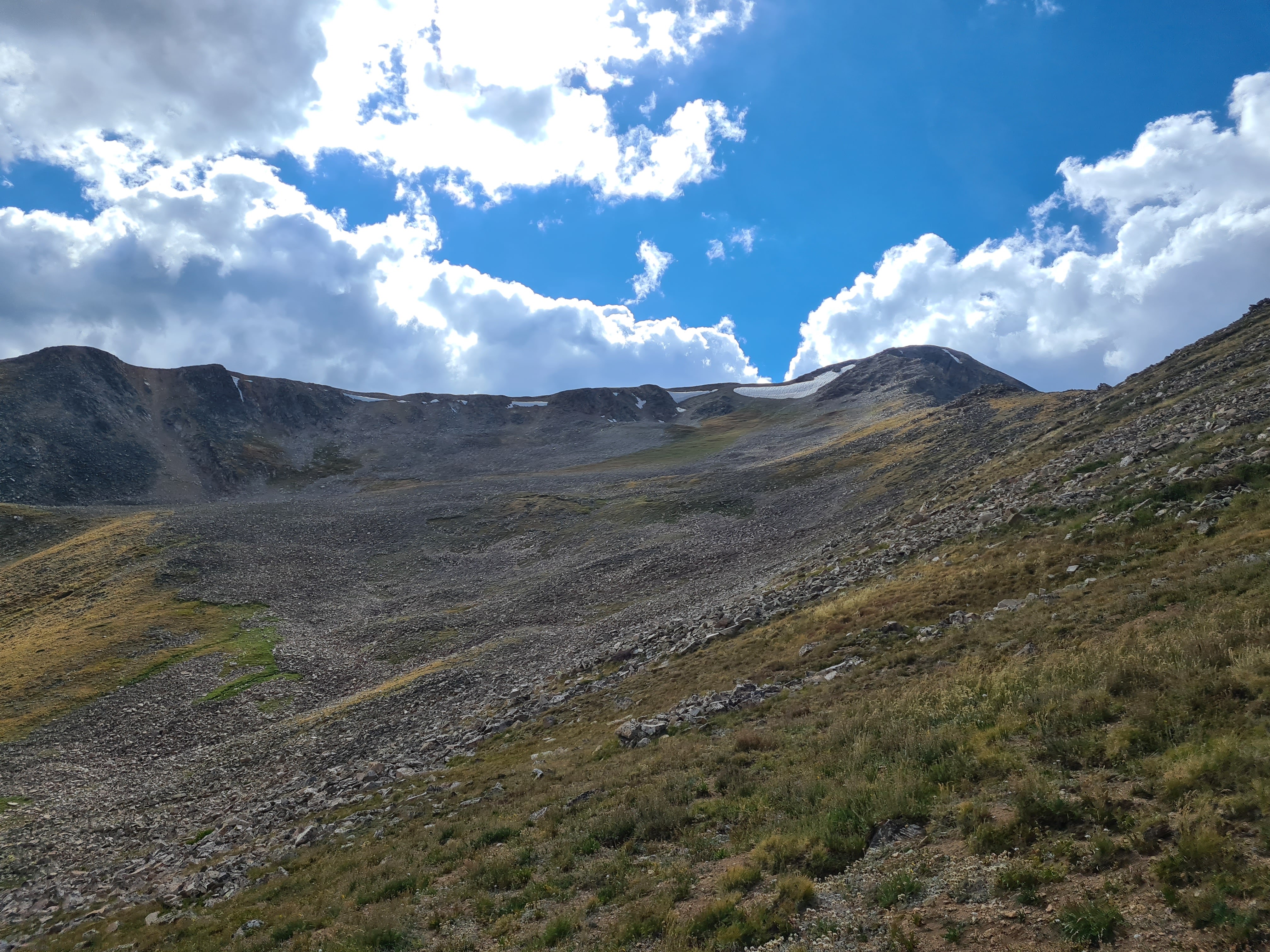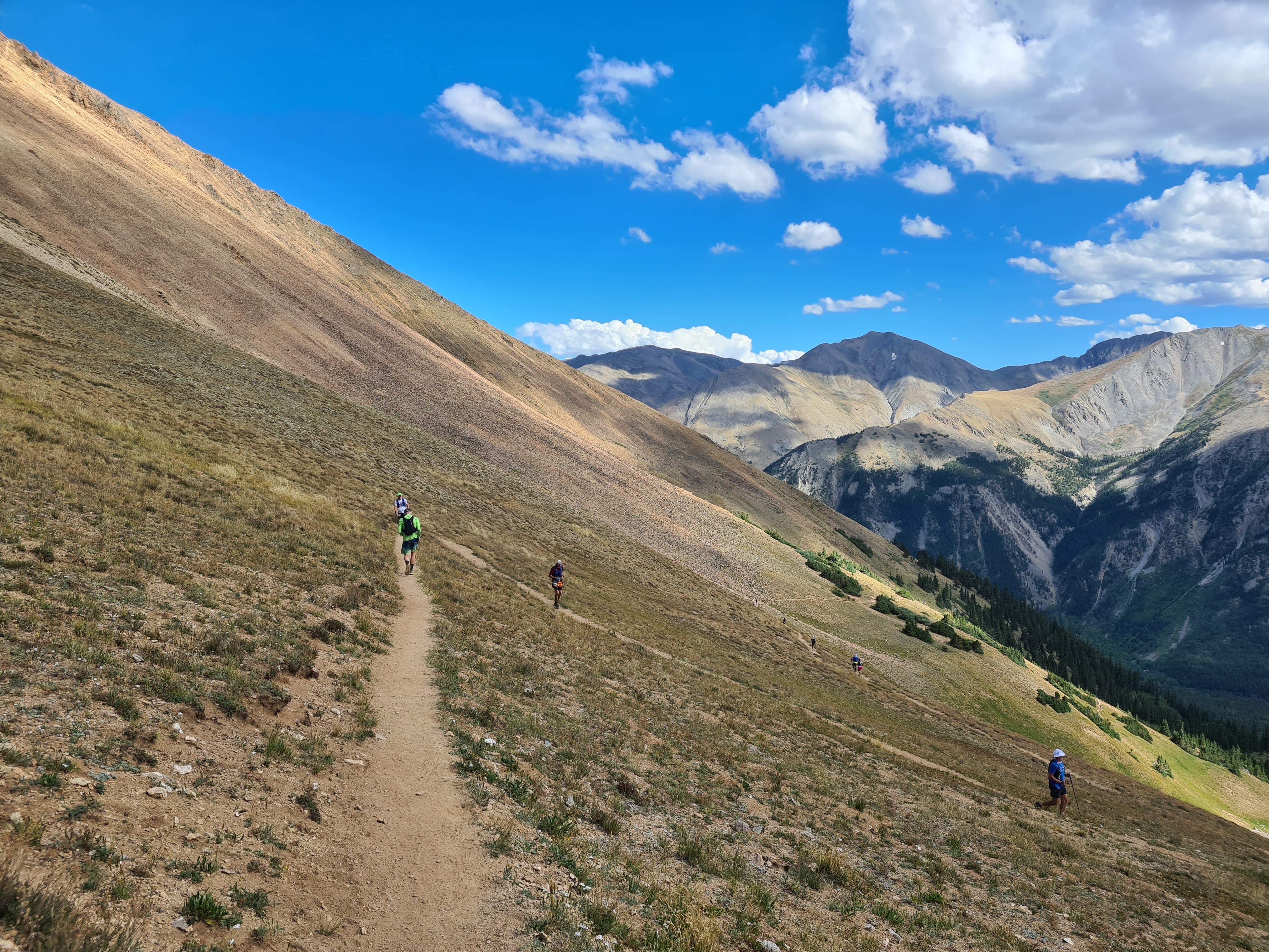 I left Twin Lakes 20 minutes ahead of cutoff and the climb up Hope Pass was wicked hard. I consumed 3 salt tabs early on and knocked back 1.5 L of electrolytes on the ~5 mile climb, successfully fighting off muscle cramping in my triceps, shoulders, and left calf. I had a bit of a nosebleed as I climbed as well, but it was relatively mild. The altitude effects were harsh on the ascent of Hope Pass; I saw people falling over from dizziness and having GI distress just off the trail with their shorts around their ankles.